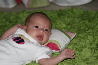 ...but that hippo in the picture with Ansley is tiny. It was a gift from her daddy when we were in the hospital. I tried to take some pictures of her with the hippo to show how much she has grown but it's hard to tell because you can't tell how small the hippo is. Anyway, I laid her down on her rug and snapped a few pics of her. You will have to excuse the outfit because it is a little big on her...everything is big on her. I am sure that she will be filling it out here shortly.